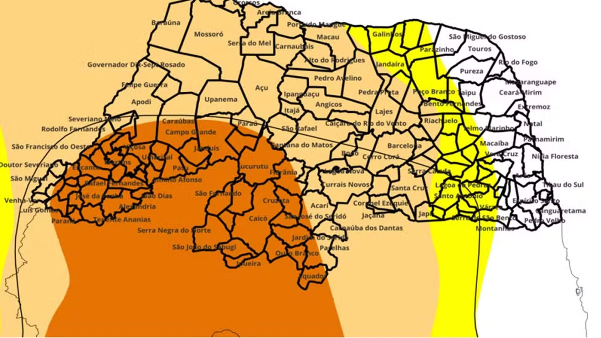 A seca moderada atingiu 34,1% dos municípios potiguares. Já a seca grave alcançou 30,5% das cidades do estado, principalmente nas regiões do Seridó e Alto Oeste.